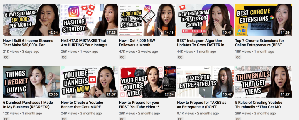Take note of how social media coach and entrepreneur Vanessa Lau uses easy to read, attention-grabbing text overlays on all of her YouTube video thumbnails, often paired with an emotive reaction: